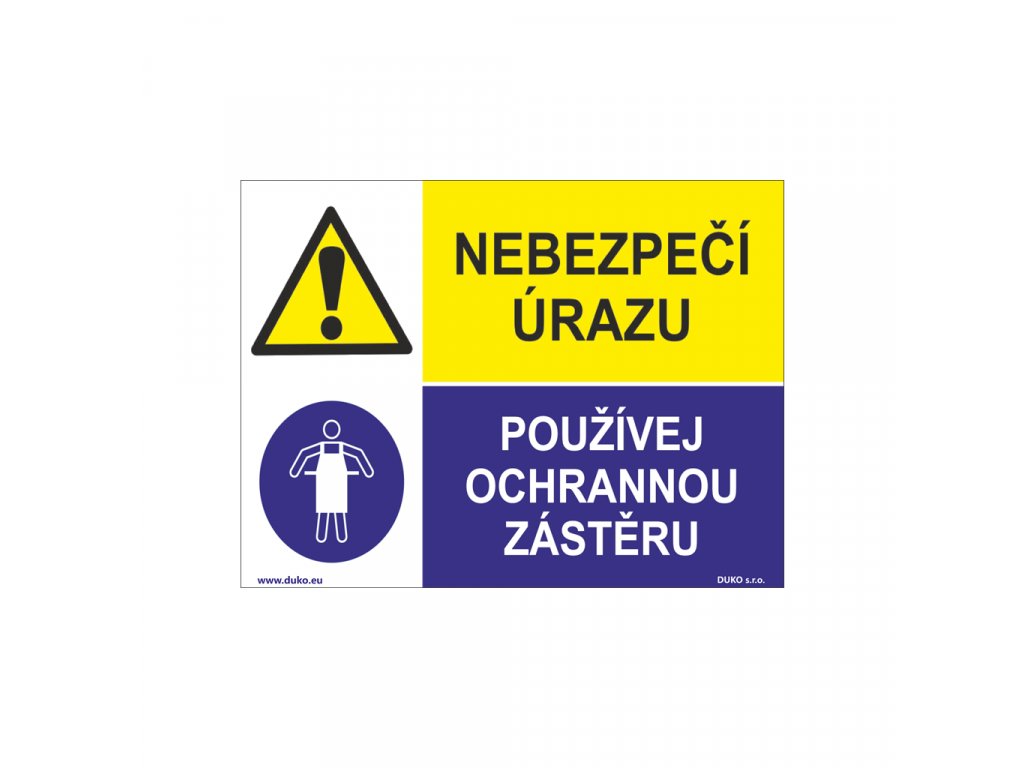 Příkazová značka NEBEZPEČÍ ÚRAZU - POUŽÍVEJ OCHRANNOU ZÁSTĚRU upozorňuje na nebezpečí úrazu a nutnost používat ochrannou zástěru během pracovní činnosti. Tato sdružená tabulka s textem a symbolem má na žlutém a modrém pozadí černé a bílé písmo. Vybrat si můžete kvalitní samolepku nebo pevnější variantu, plastovou tabulku s nalepenou bezpečnostní značkou.