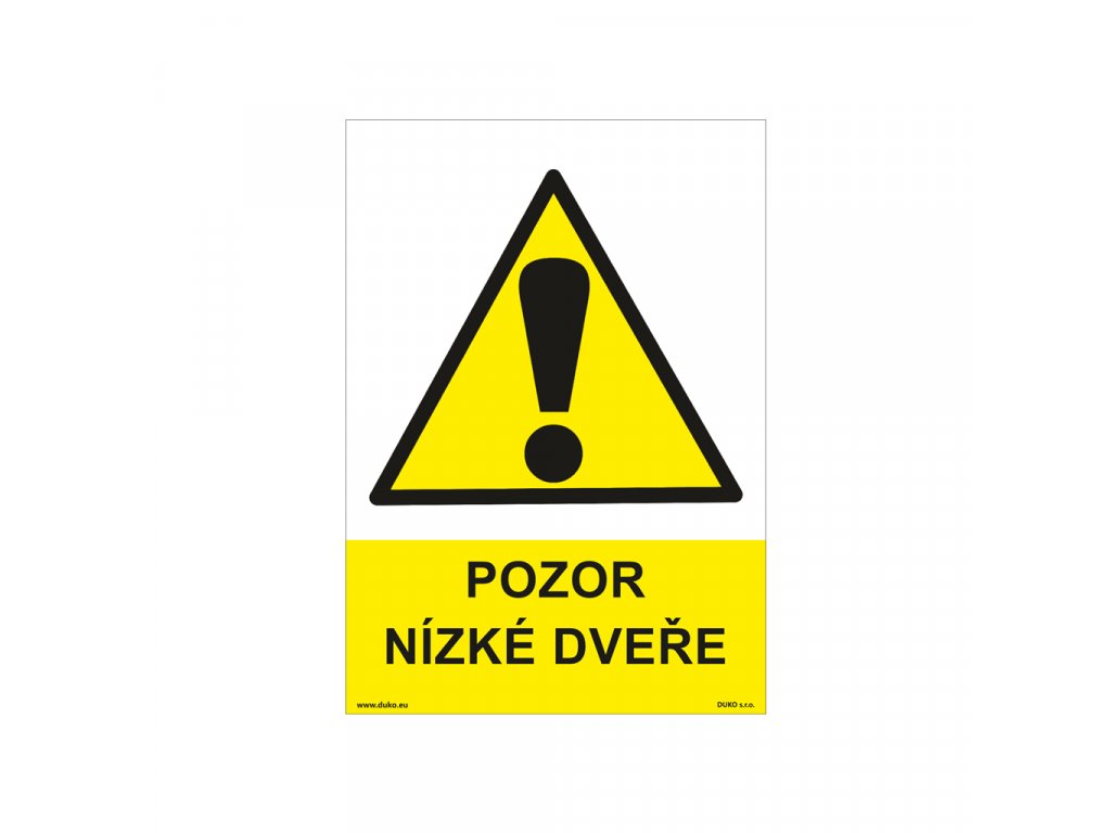 Výstražná cedulka POZOR NÍZKÉ DVEŘE upozorňuje na dveře s nedostatečnou průchozí výškou, a tedy na možné nebezpečí úrazu. Tabulka se symbolem a textem má černý nápis na žlutém pozadí. Je vyrobená jako kvalitní samolepka nebo pevnější varianta, plastová cedulka s nalepenou bezpečnostní značkou.